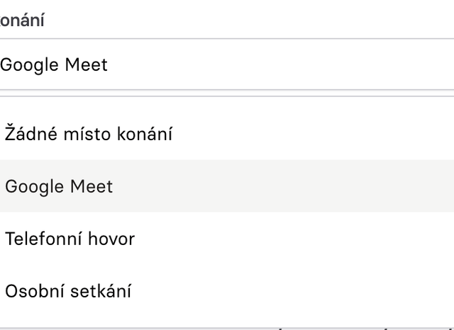 V události lze snadno nastavit místo konání. Je možné si zvolit osobní setkání, hovor přes Google Meet nebo telefonický rozhovor. Díky tomu účastníci přesně vědí, kde mají být, nebo jak se připojit.